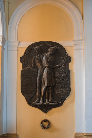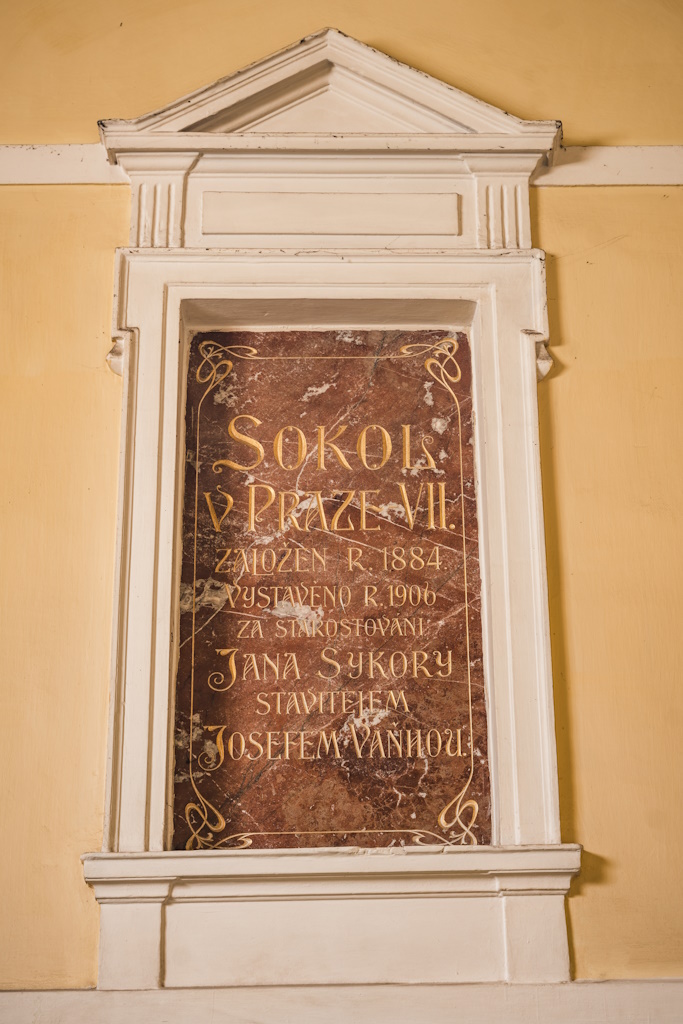 Pamětní deska k výstavbě sokolovny Sokola v Praze VII